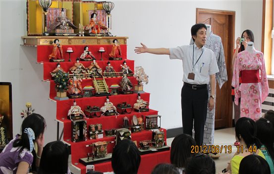 文化领事大谷先生向同学们介绍女孩节人偶