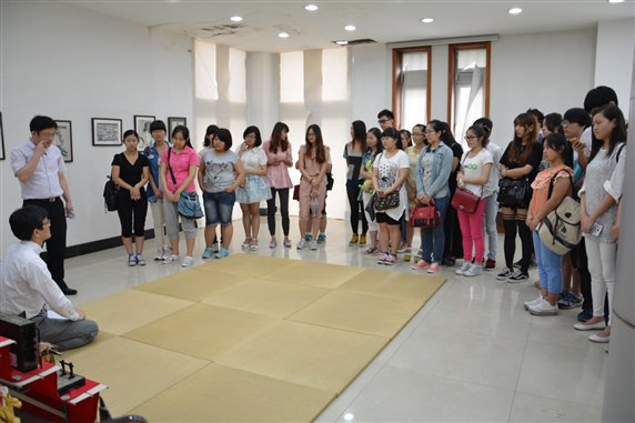 在日本领事馆内,同学们先通过一段精彩的视频展示,了解了日本的风土人情和文化特色,再经文化参赞对领事馆内各项独具特色的展品依次介绍,同学们表现了对日本文化浓厚的兴趣。讲解结束后,同学们根据自己的兴趣,对不同的日本民族展品进行了亲身体验。其中,日本的端茶偶人引起了同学们极大的兴趣。小小的人偶双手捧着茶盘,把茶杯放在茶盘上,它便会向前走,把茶端给客人,客人喝完茶把茶杯放回茶盘上时,它就又转回原来的地方。在讲解员的演示后,同学们对端茶偶人进行了有趣的体验。此外,还有剑球、 江户陀螺、日本风筝等,都引起了同学们极大的兴趣,带给了大家不一样的日本文化体验,深深感受到日本文化的魅力。活动结束后,工作室成员合影留念,同时也表达了对领事馆工作人员的感谢。